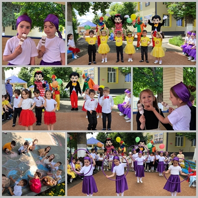 Для воспитанников второй группы раннего возраста было организовано спортивное развлечение. Дети вместе с воспитателями подготовили праздничный концерт. Затем праздник продолжился рисованием на асфальте цветными мелками. И в завершении праздника весёлые клоуны Мишка и Тишка, мышата Мики и Мини Маусы угостили детей мороженым, за которое огромное спасибо Президенту Регионального общественного фонда имени Героя России Ахмата-Хаджи Кадырова Аймани Несиевне.