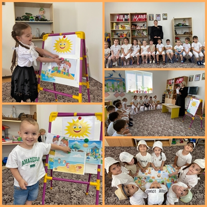 Иман Шамильевна в игровой форме рассказала детям о том, что солнце дает свет и тепло всему живому на нашей планете и многие явления природы на земле зависят от Солнца. Но, иногда солнце бывает опасным, под его палящими лучами можно перегреться и получить солнечный ожог. Воспитанники рассмотрели понятие солнечный удар, вспомнили об опасностях, связанных с неправильным поведением в жаркую погоду.